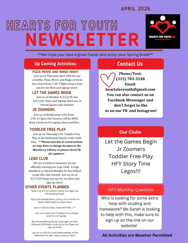 Hearts For Youth, Inc (HFY, Inc.) is a 501(c)3 non-profit organization based in the town of Alexandria, NY which is dedicated to providing opportunities for students through after-school and summer programs to teach life skills, so youth in our community will become healthy, educated, respectful, and productive citizens. We reach over 400 youth annually through our numerous programs such as cooking classes, sewing classes, book clubs, photography, kayaking, fishing, golf, painting, and crafts. The target population is all school-age youth although some of our programs are designed for birth-preschool ages. More than 65% of the children engaged in HFY are from lower-income families, so we work to offer programs at no or very low cost to participants.